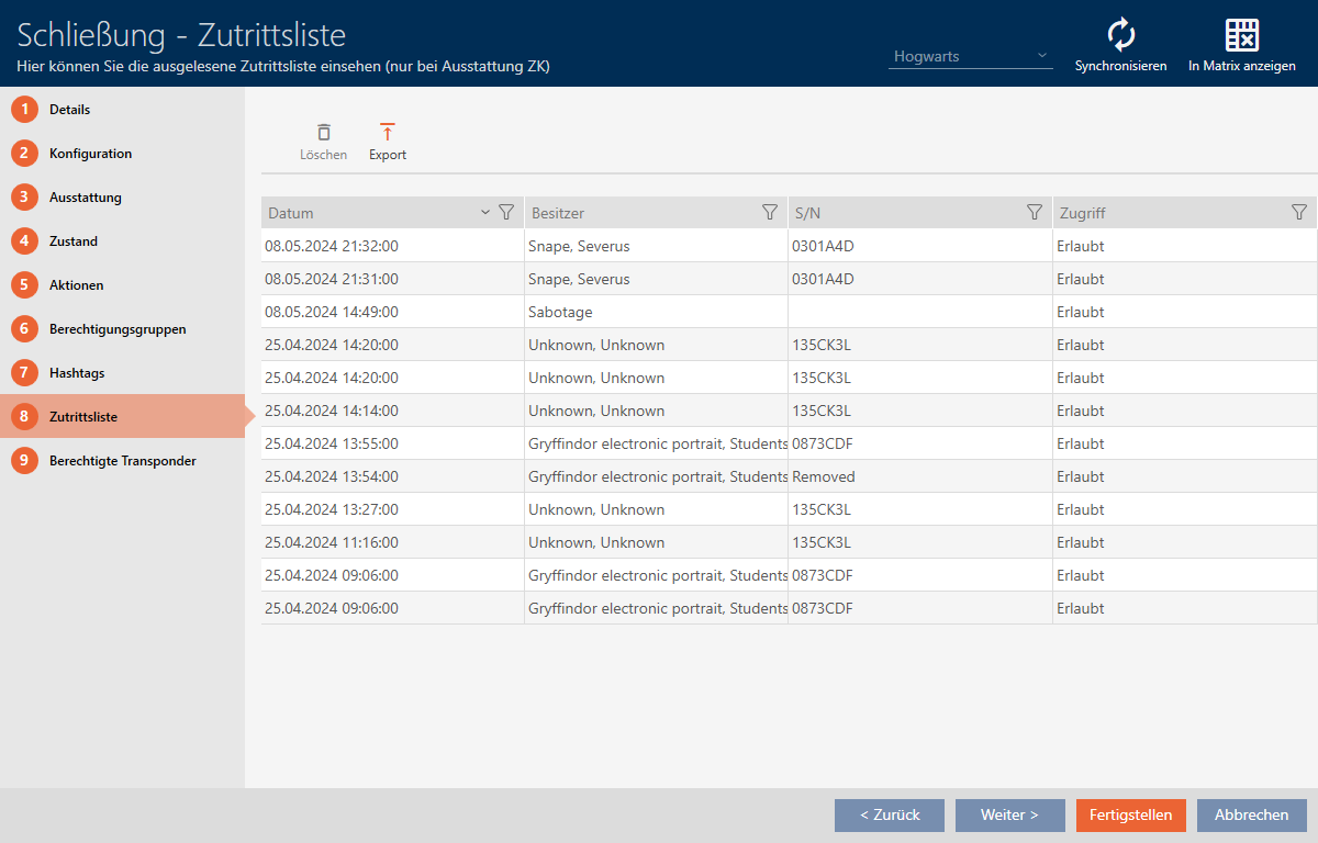 Med ZK-funktionen (=adgangskontrol) kan låsene protokollere, hvilke identifikationsmedier der blev aktiveret (se Lade adgange protokollere med lås (adgangsliste)). Derefter kan de protokollerede adgange f.eks. udlæses under synkroniseringen og skrives i databasen (se Udlæsning af adgangsliste/inspektionsliste under synkronisering og Synkronisering af lås (inkl. udlæsning af adgangsliste)).