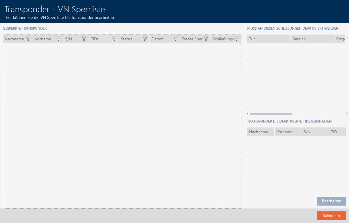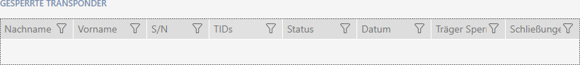Aktuell ist in diesem Fenster kein Eintrag enthalten, weil Sie noch keinen Transponder gesperrt haben. Das Fenster besteht aus mehreren Teilen: