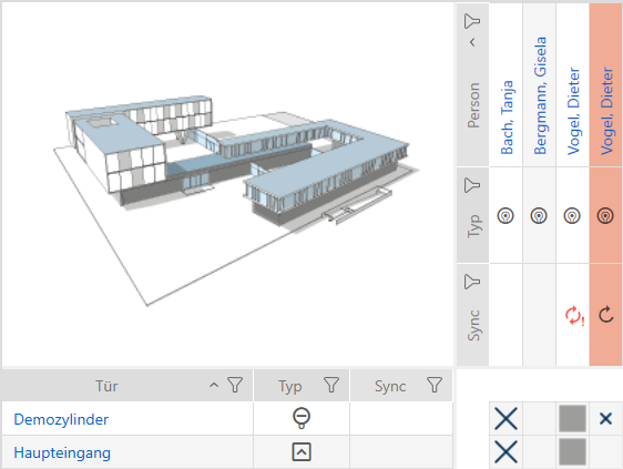 Außerdem verschwindet der Programmierbedarf an der Schließung aus der Matrix und das Berechtigungskreuz des gesperrten Transponders ist entfernt: