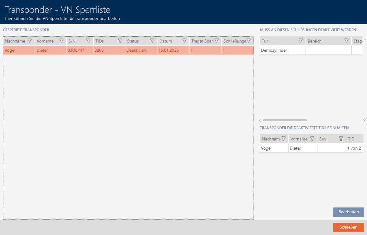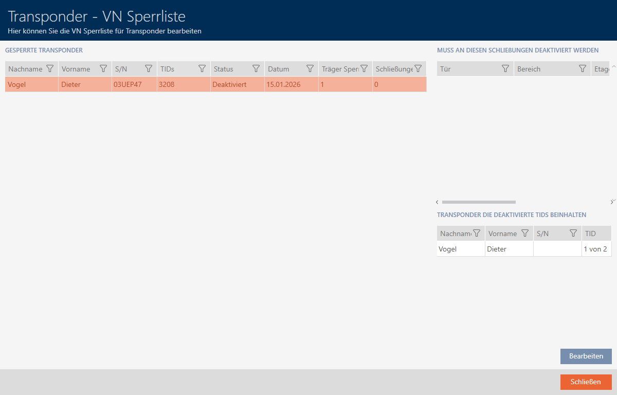 - Da der gesperrte Transponder an einer Schließung berechtigt war, steht diese Schließung in der Liste .