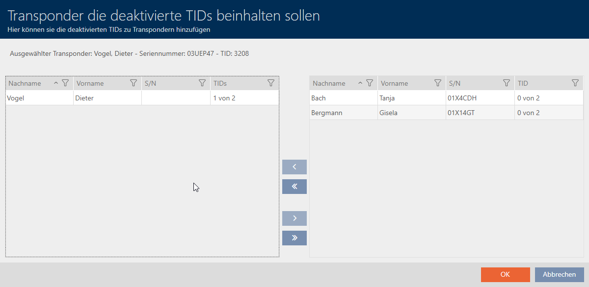 - Optional: Sie können die Sperr-ID weiteren Transpondern aus der rechten Spalte zuweisen.