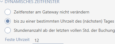 Mit dem dynamischen Zeitfenster (="Zeitbudget") stellen Sie sicher, dass die Identmedien in Ihrer Schließanlage regelmäßig am Gateway betätigt werden (weitere Informationen siehe Virtuelles Netzwerk).