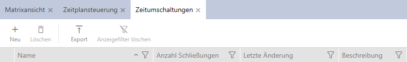 - Zeitumschaltung ist erstellt und wird aufgelistet. Fahren Sie ggfs. mit Schließungen mit Zeitumschaltung automatisch einkuppeln und auskuppeln fort.