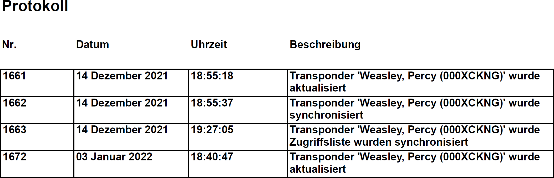 Dieser Abschnitt ist ein Änderungsprotokoll. Hier werden alle Einträge der Datenbank ausgegeben, die diese Person bzw. deren Identmedium betreffen (siehe auch Aktivitäten an der Datenbank nachverfolgen (Protokoll)).