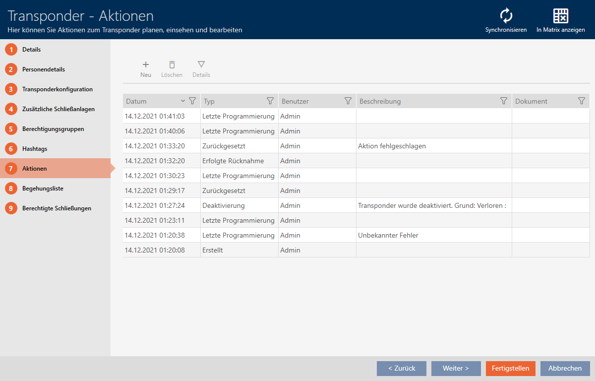Not all entries are available for all types of identification medium. Since a PIN cannot be withdrawn like a transponder, for example, the entries and are not available for PIN code keypads.