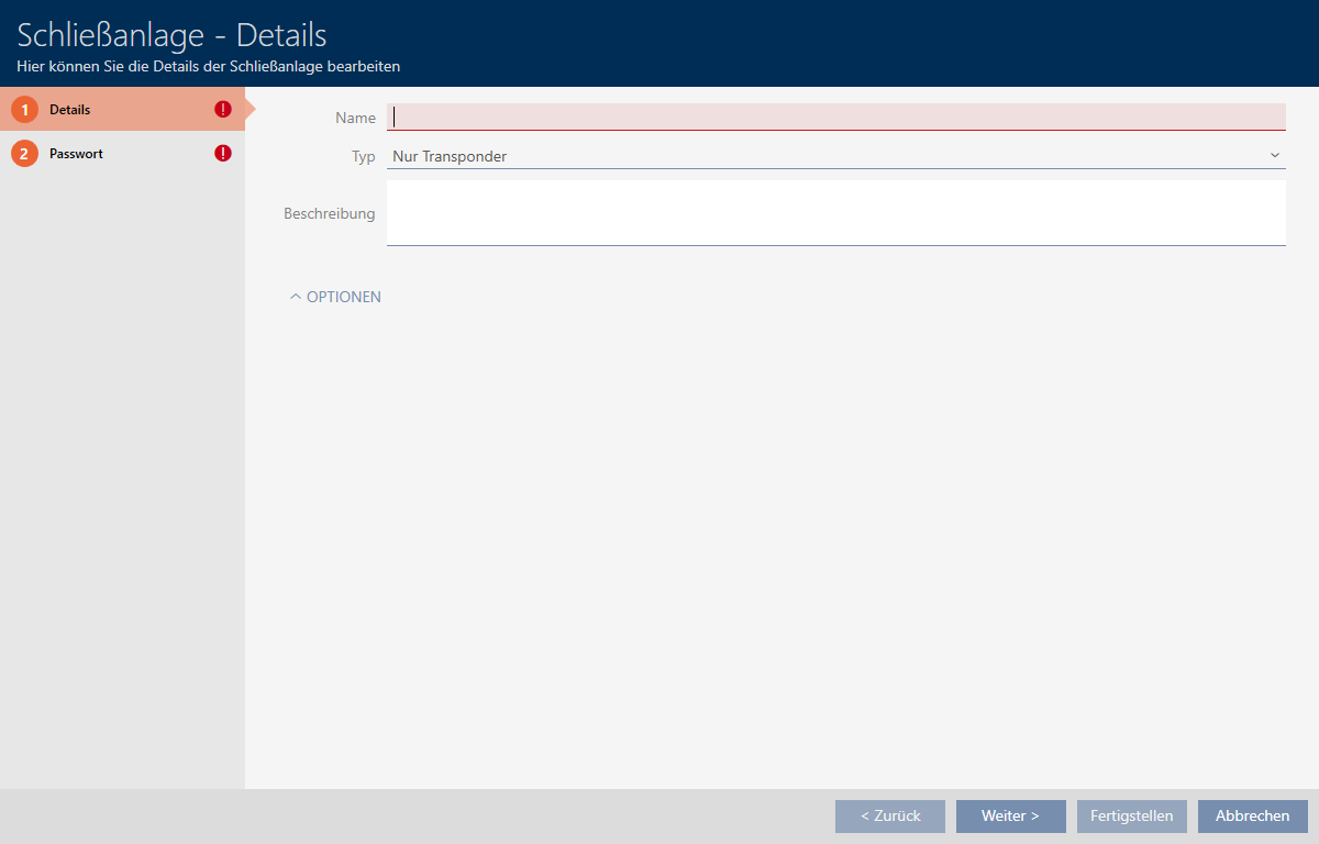 You have probably already created your first locking system with the wizard after starting your project (see First steps after a new installation). You can create additional locking systems in the tab: