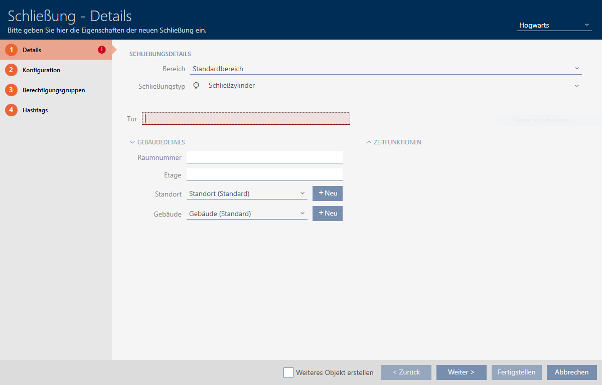 As soon as you have created the locking device and clicked on the Fertigstellenbutton, AXM Plus knows your locking device type. It will then hide all non-relevant settings.