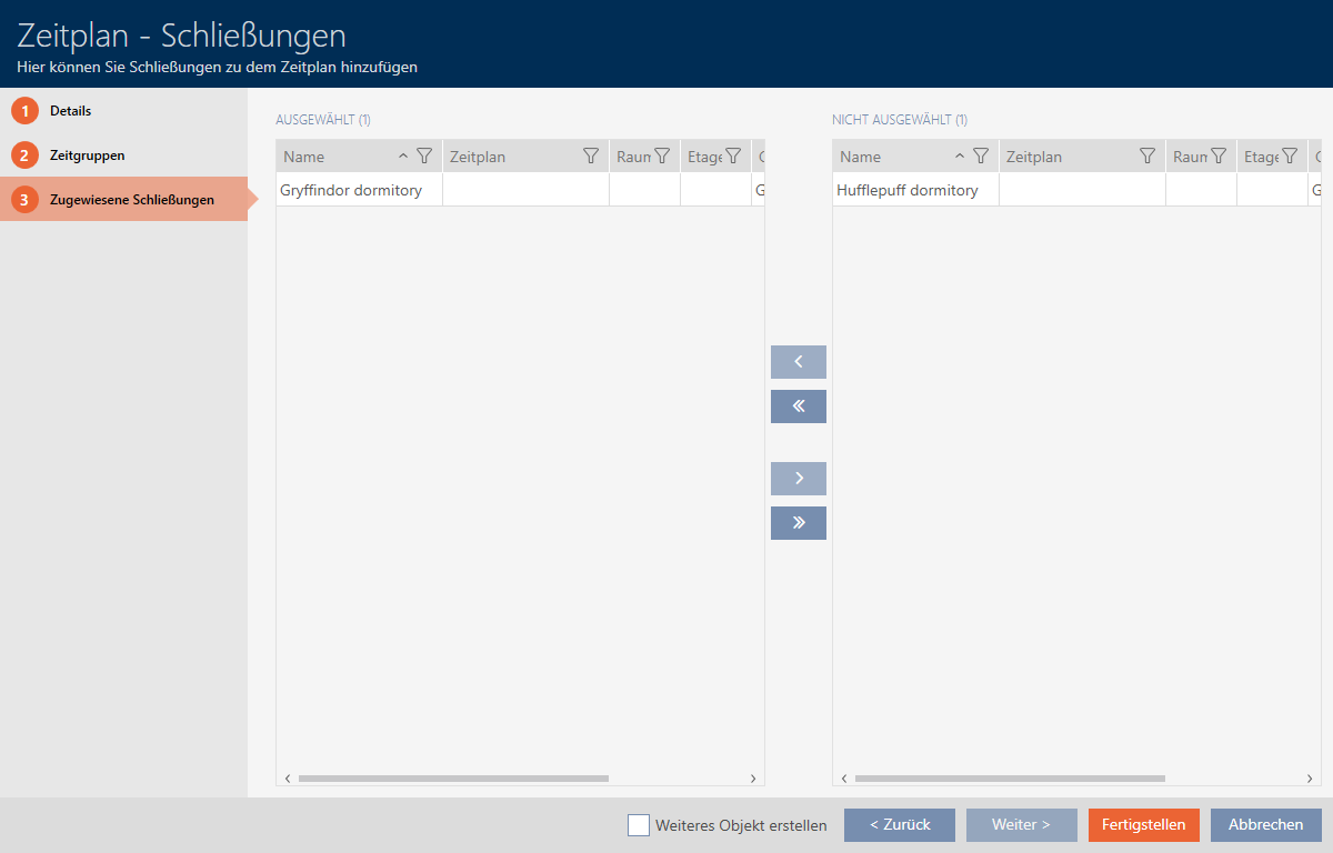 Sometimes, however, you have already created locking devices and only later decide to control authorisations in terms of time, for example. In this case, you simply add the locking devices to your schedules at a later date.