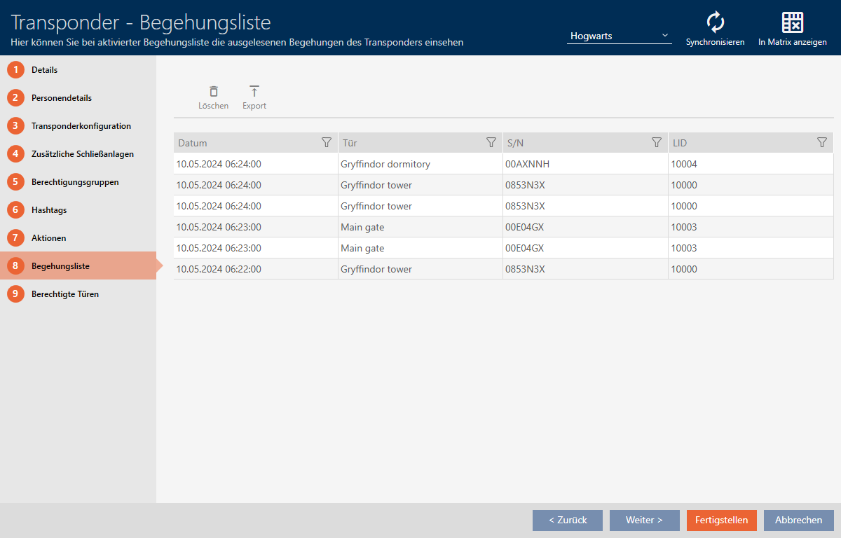 Displaying and exporting physical access lists for cards/transponders - AXM Plus