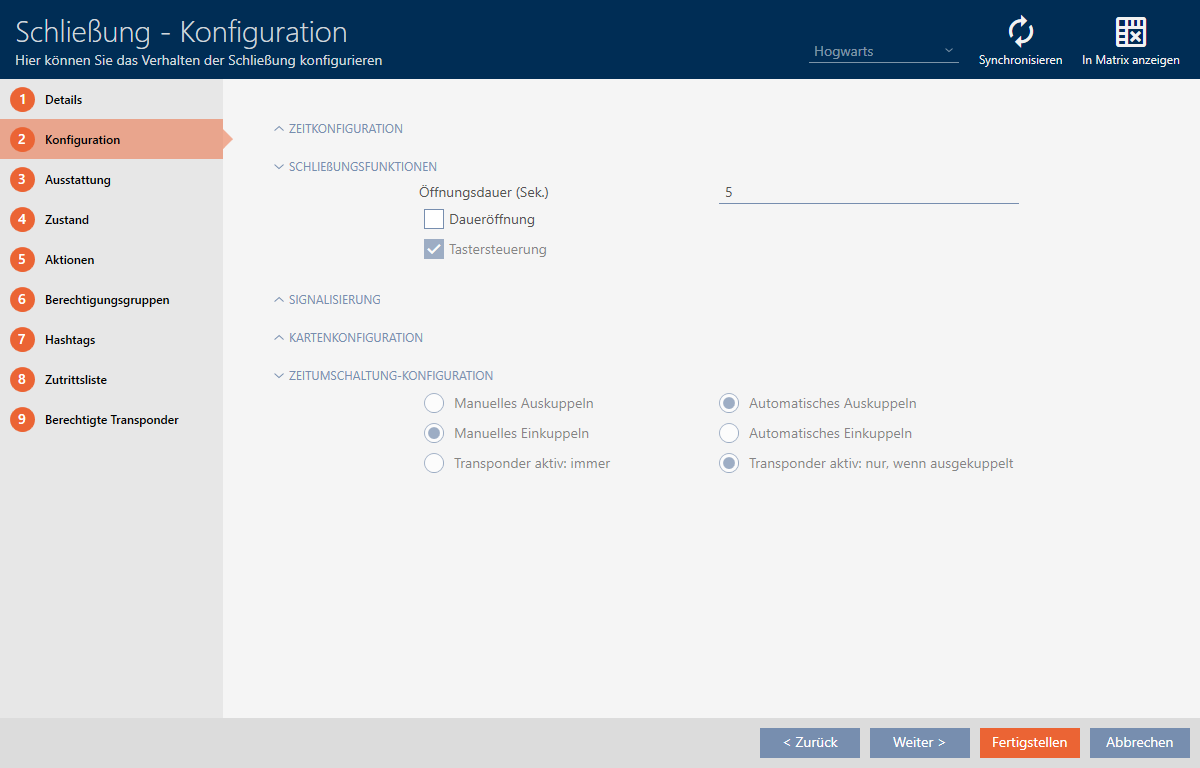 Dans l'idéal, vous avez déjà créé vos commutation en fonction de l’heures avant de créer les fermetures (voir Meilleure pratique : Installer un système de fermeture et Créer une commutation en fonction de l'heure). Vous pouvez ainsi définir les commutations en fonction de l’heures directement dans les propriétés de la fermeture lors de la création des fermetures :