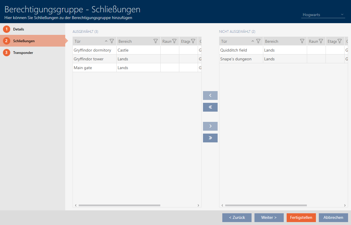 Nel caso ideale, avete già creato le vostre gruppi di autorizzazini prima di creare le chiusure (vedere Best Practice: Realizzazione dell’impianto di chiusura e Creazione di gruppi di autorizzazioni). Questo permette di impostare i gruppi di autorizzazione direttamente nelle proprietà delle chiusure e dei mezzi di identificazione quando vengono creati: