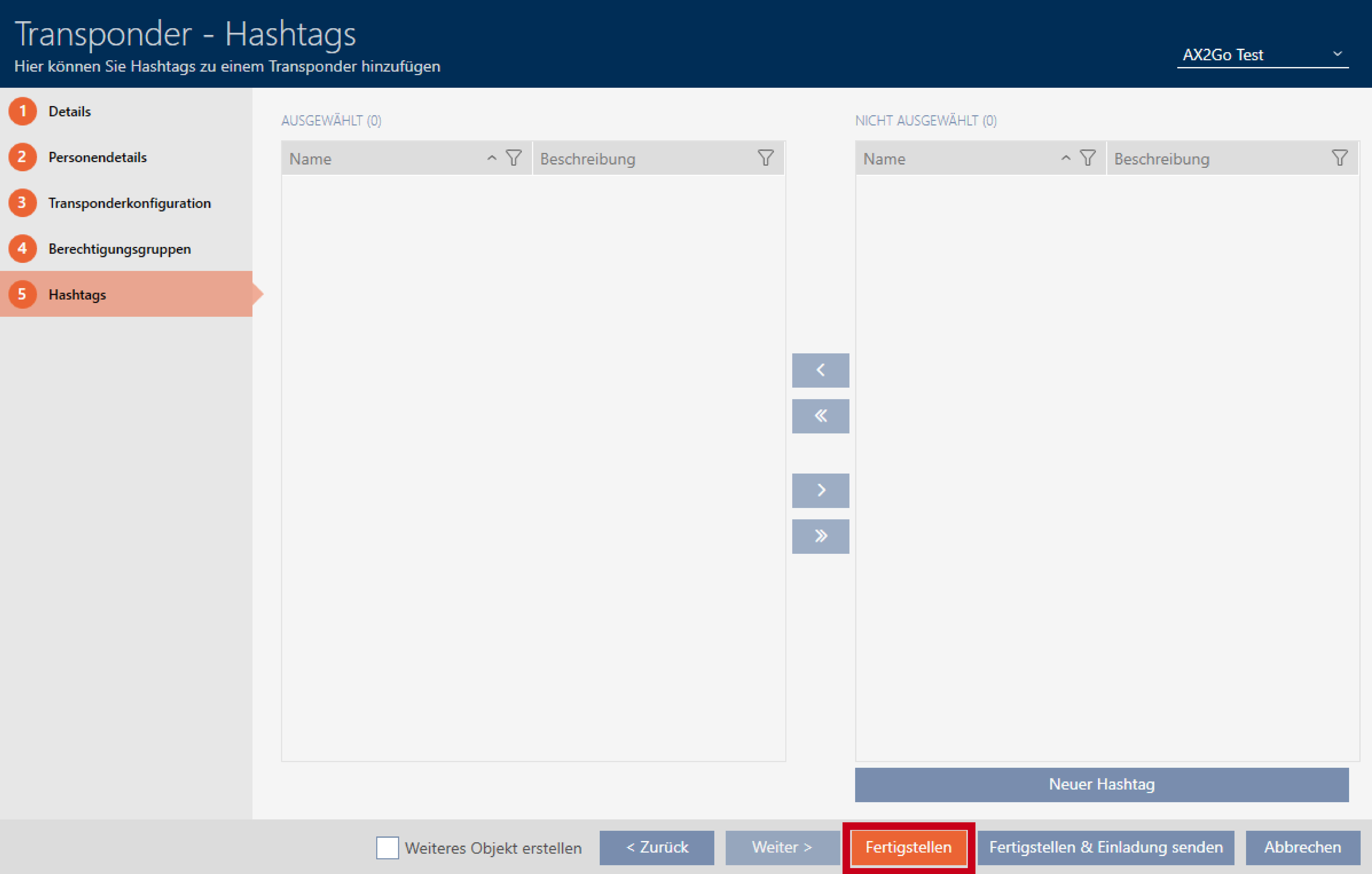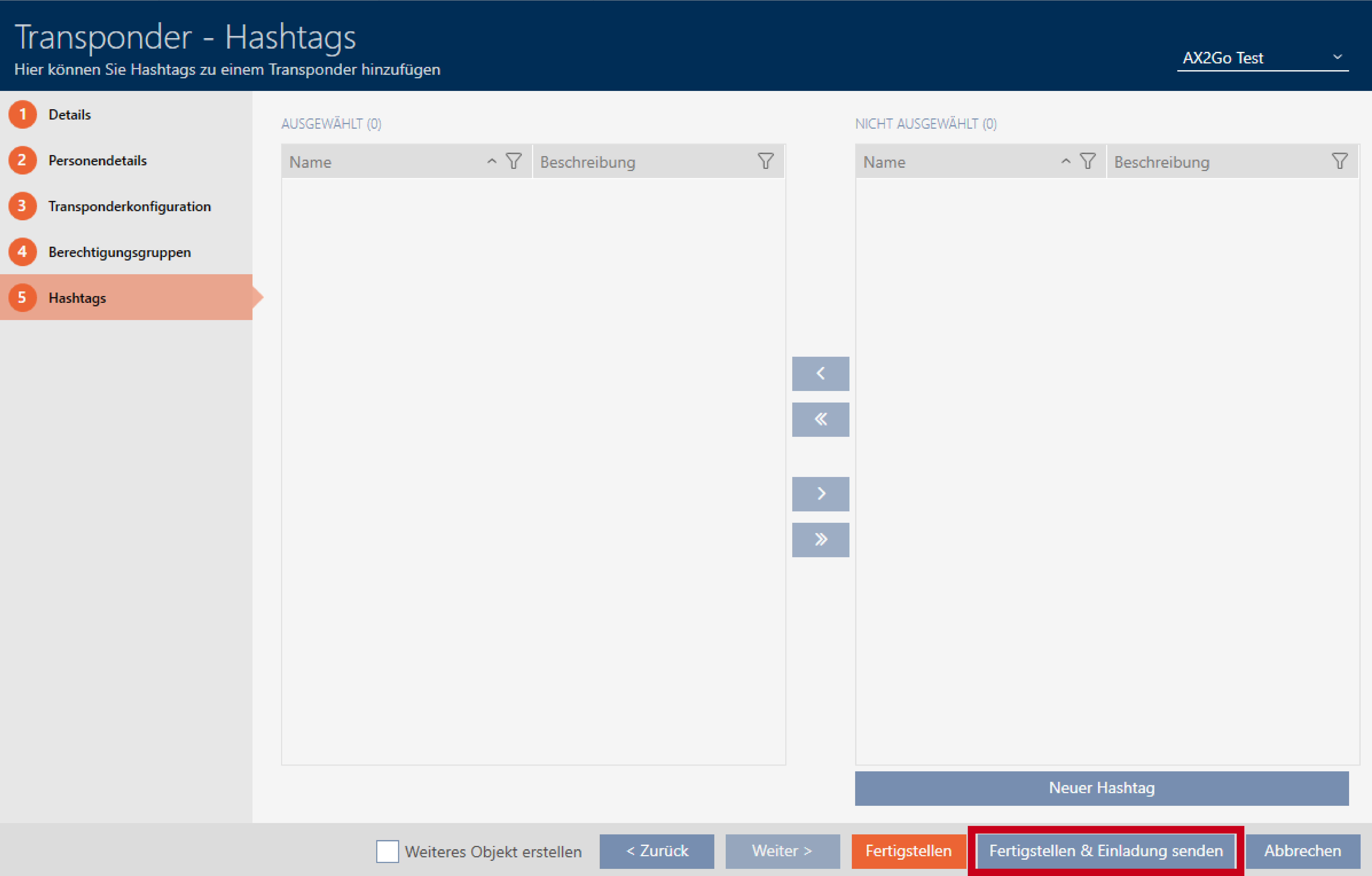 Meer informatie, zie Transponders en kaarten aanmaken, Hashtag aanmaken en Autorisatiegroepen. - Wanneer u alle voor u relevante instellingen hebt uitgevoerd, kunt u de configuratie voltooien en onmiddellijk een uitnodiging verzenden. Klik hiervoor op de button .
