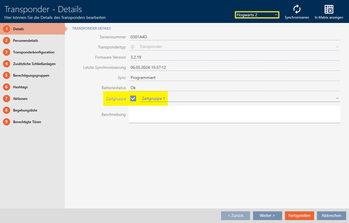 Als u in het dropdownmenu van sluitsysteem wisselt, kunt u voor het identificatiemedium in dit sluitsysteem een andere tijdgroep selecteren.