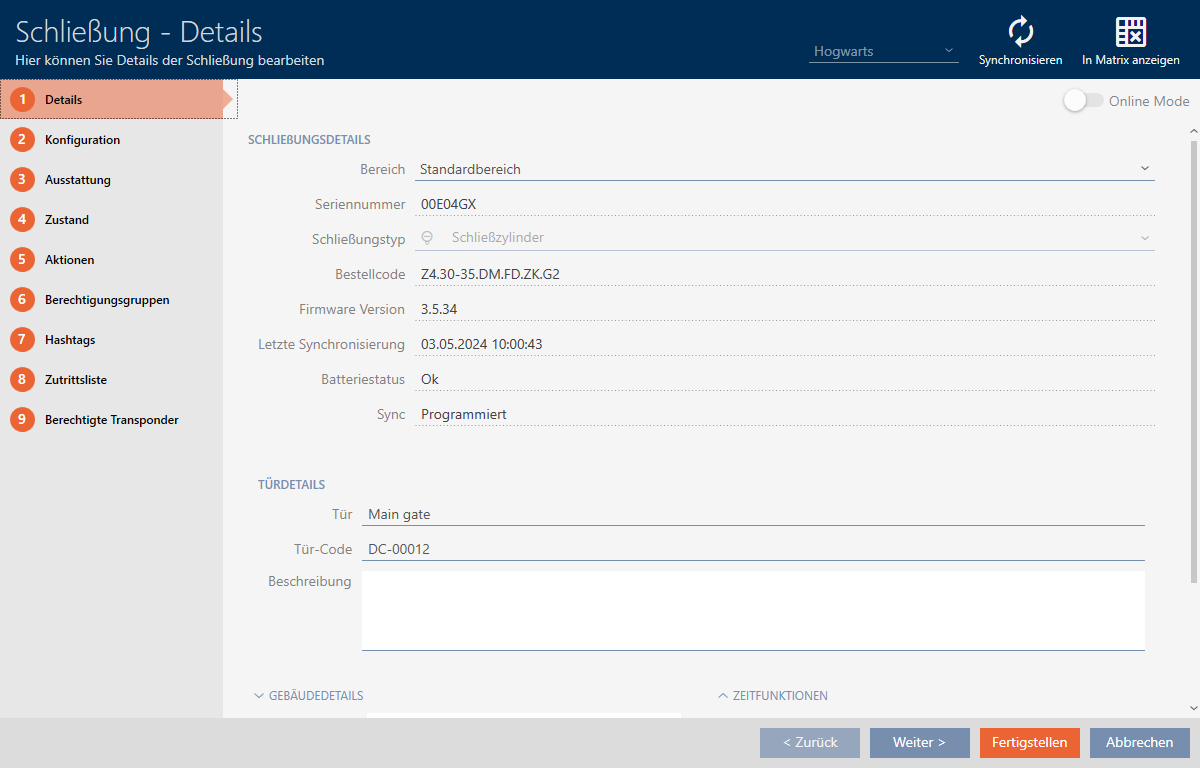 - Klik op het sluitelement waarvoor u DoorMonitoring wilt configureren.
