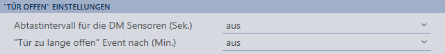 "Deur te lang open" event na (min.) | Veiligheidsrelevante deuren zoals branddeuren mogen niet permanent geopend zijn. Met deze instelling kunt u herkennen of een deur langer dan normaal openstaat. Deze deur kan bijvoorbeeld geblokkeerd zijn. Na afloop van de ingestelde tijd wordt de gebeurtenis Deur te lang open geactiveerd. Beschikbare tijden: