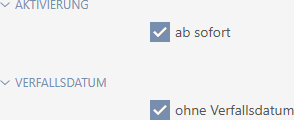 Met een activerings- of afloopdatum bespaart u zich deze moeite. Het identificatiemedium wordt automatisch op een bepaald tijdstip bij geautoriseerde sluitelementen geaccepteerd (activeringsdatum) of juist niet meer geaccepteerd (afloopdatum).