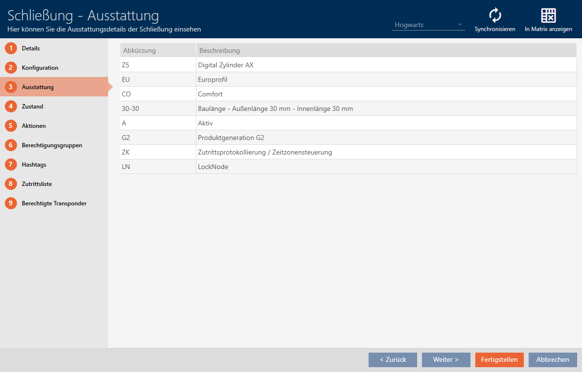 Tijdens de synchronisatie worden ook de uitrustingskenmerken van een sluitelement uitgelezen. Zo kan de AXM Plus controleren of het sluitelement de gewenste instellingen überhaupt beheerst (bijv. of er een ZK-functie aanwezig is).