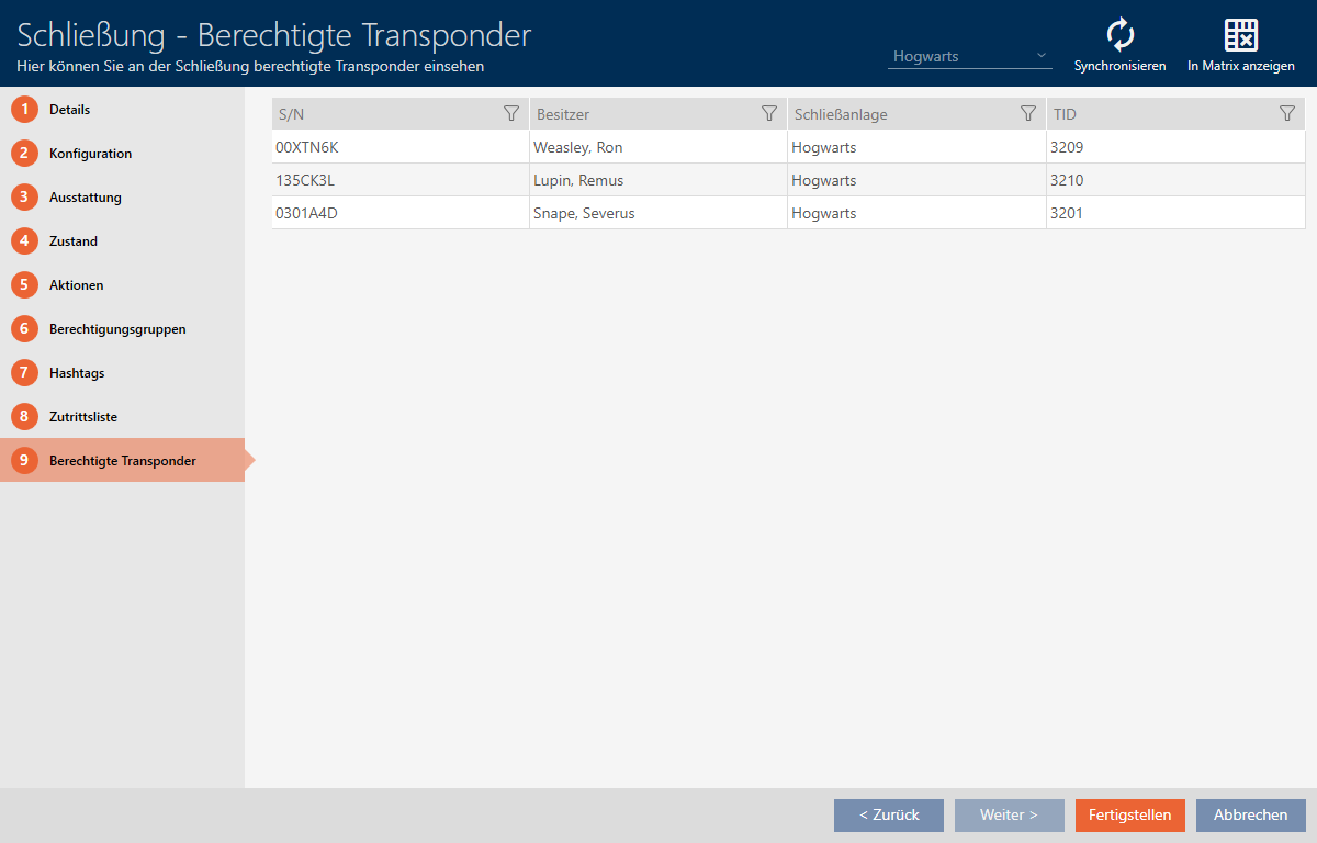 (zie ). Sorteren en filteren - Klik op het sluitelement waarvan u de bevoegde identificatiemedia wilt weergeven.