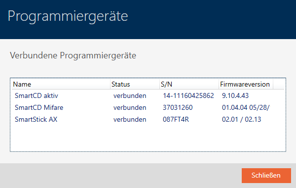 Dit venster toont alle ondersteunde programmeerapparaten. Naargelang de editie van de AXM die u gebruikt, worden andere programmeerapparaten ondersteund (zie Functieomvang AXM Lite). In de statuskolom ziet u of een programmeerapparaat is aangesloten en door de AXM Plus wordt herkend.
