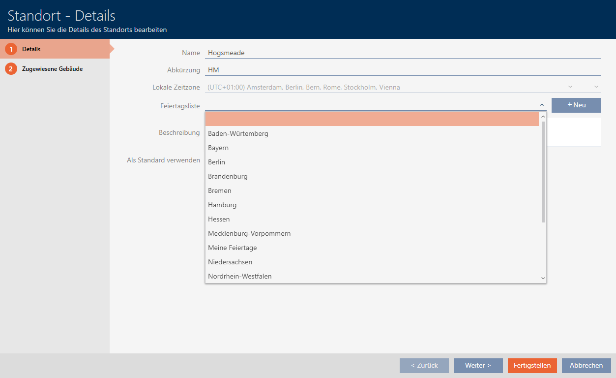Wanneer in plaats van het sluitelement een lijst met vrije dagen aan de locatie is toegewezen, dan wordt de lijst met vrije dagen van de locatie voor het sluitelement overgenomen. In het venster van het sluitelement herkent u dat aan de toevoeging '(overgenomen)'.