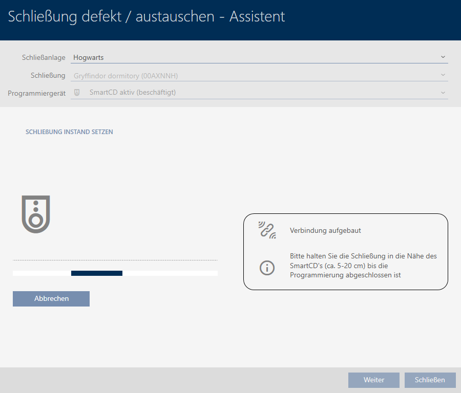 . - De wizard voor de behandeling van een defect sluitelement gaat open.