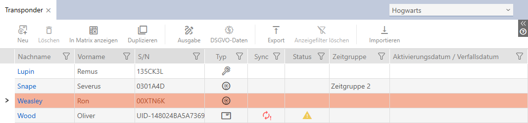 Bovendien kunt u ook de uitgiftedatum direct in de actielijst van het betreffende identificatiemedium vermelden (zie Uitgiftedatum transponder/kaart noteren).