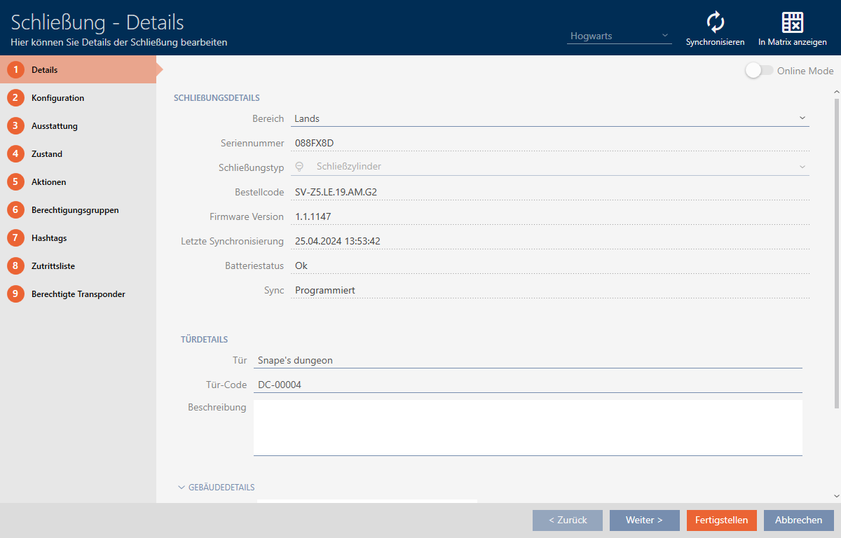 Wanneer in plaats van het sluitelement een tijdschema aan de zone is toegewezen, wordt het tijdschema van de zone voor het sluitelement overgenomen. In het venster van het sluitelement herkent u dat aan de toevoeging '(overgenomen)'.