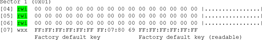 - Beschikbare sectoren zijn in het rapport herkenbaar aan drie blokken met [rwi]: read/write/increment – het vierde blok is bestemd voor de encryptie.