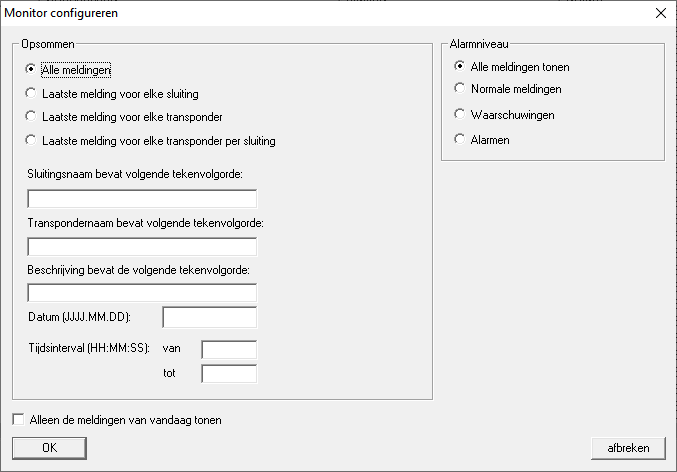 | Laat voor elk sluitelement en iedere transponder alle meldingen weergeven (tenzij u gebruik maakt van de beperking door tekenvolgordes of een tijdsinterval). |
