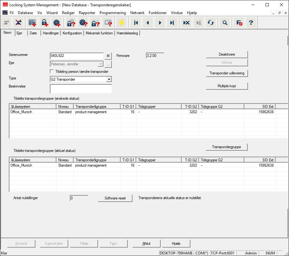 - Tildelte transpondergrupper: Aktuel status