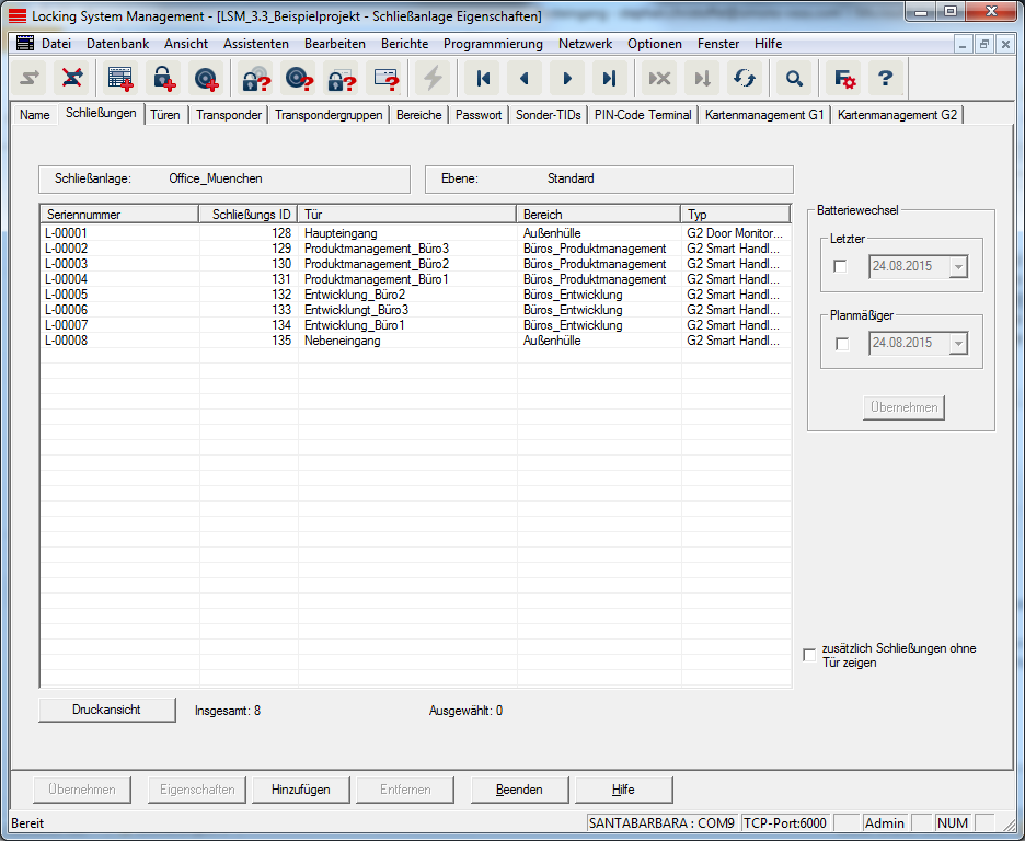 Diese Registerkarte verschafft einen Überblick über die in der Schließanlage eingesetzten Schließungen. Diese werden alle detailliert in einer Tabelle angezeigt.