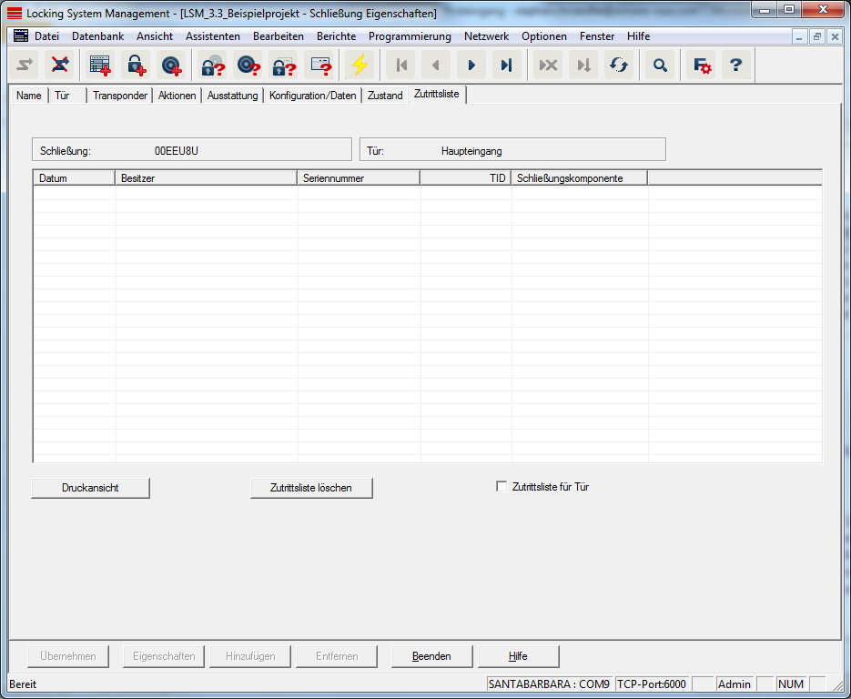 - Die Zutrittsliste wird automatisch dargestellt und gespeichert. Sie kann jetzt jederzeit über die Registerkarte Zutrittsliste in den Schließungseigenschaften angezeigt werden.
