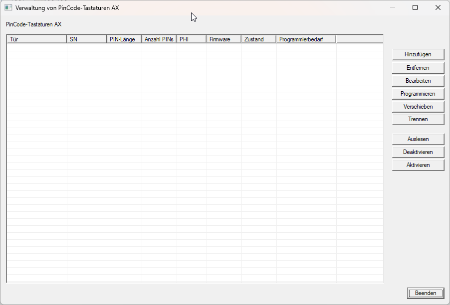 - Mindestens eine programmierte AX-Schließung vorhanden, die mit der PinCode-Tastatur AX verbunden werden soll (siehe auch PinCode-Tastaturen und Neue Schließung anlegen).