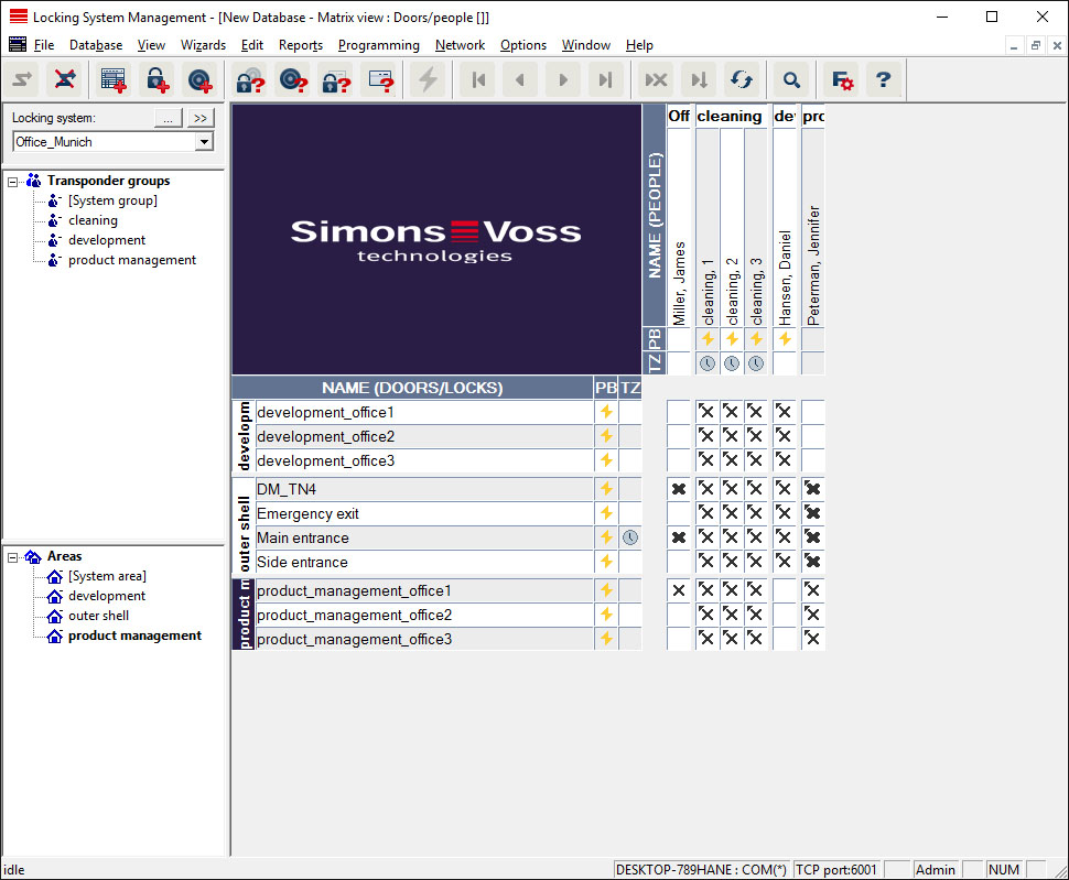 This view displays the individual authorisations for all persons for individual doors. Obviously, the matrix is extensive as a result. However, it allows precise setting of exceptional-case authorisations, enabling pre-set group authorisations to be extended or even reduced. This view is thus suitable for implementing individual extensions or restrictions after the basic structure has been established at Areas view/Transponder groups.