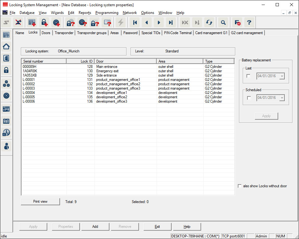 This tab gives you an overview of the locking devices used in the locking system. The devices are all displayed in detail in a table.