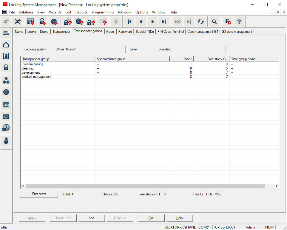 This tab gives you an overview of the transponder groups used in the locking system. The devices are all displayed in detail in a table.