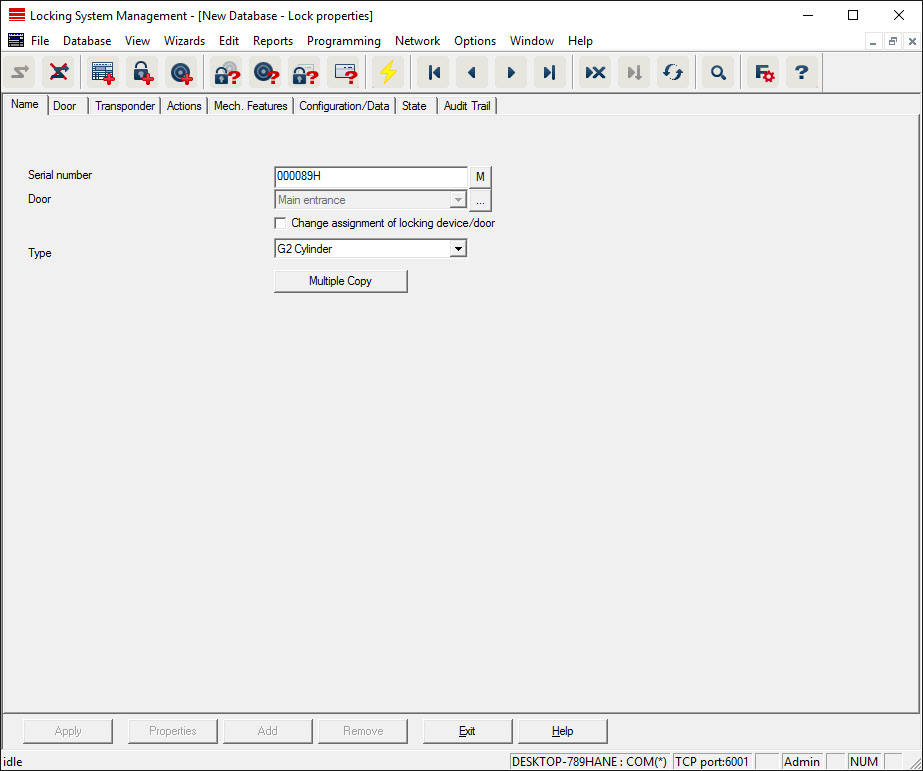 - Displays the locking device's serial number. The "..." button shows the door's properties.