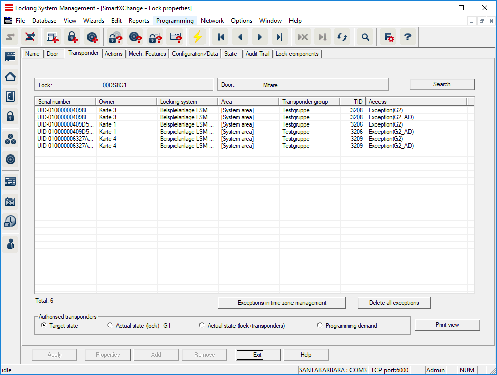 - Shows all transponders authorised for the locking device in a detailed list.