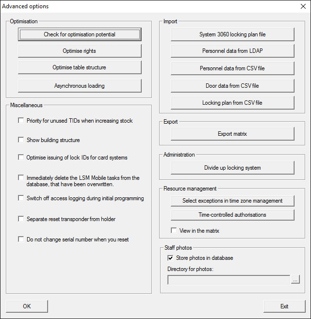 Advanced - LSM 3.5 SP3 BasicEnsure that you always have a fully functional, up-to-date data backup before optimising the database. Further informationCheck need for optimisationOptimise authorisationsOptimise table structureAsynchronous loadingMiscellaneousSystem 3060 locking plan fileEmployee data from LDAPEmployee data from CSV fileDoor data from CSV fileLocking plan from CSV fileExport matrixDivide locking systemEmployee photos