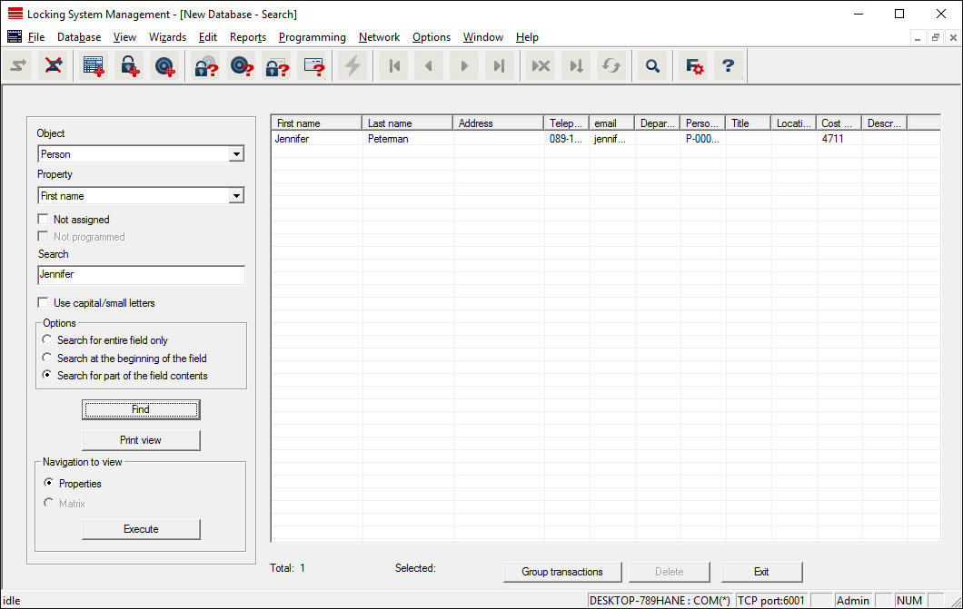 The search enables you to search easily for different items, such as a specific door or a specific transponder.