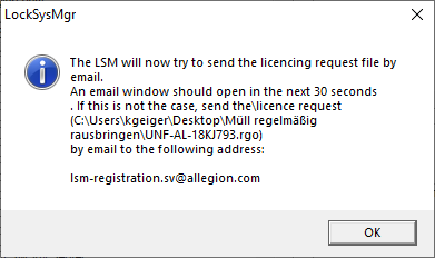 LSM needs to be registered. A registration file is created for this purpose and sent to a designated email address. You will then automatically receive a reply which contains your personal licence file. You can use this licence file to register LSM with the modules that you ordered.