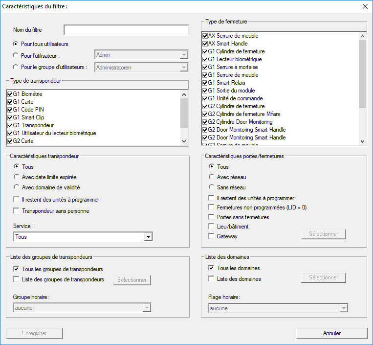 La gestion d'une installation de fermeture est encore facilitée par l’ajout de filtres. Vous pouvez sélectionner plusieurs options de filtrage et associer les filtres à différentes personnes ou à des groupes de personnes. La fonction de filtrage vous permet non seulement d'obtenir des informations complémentaires via l’affichage de lignes supplémentaires, mais également de bénéficier d'aperçus très clairs.