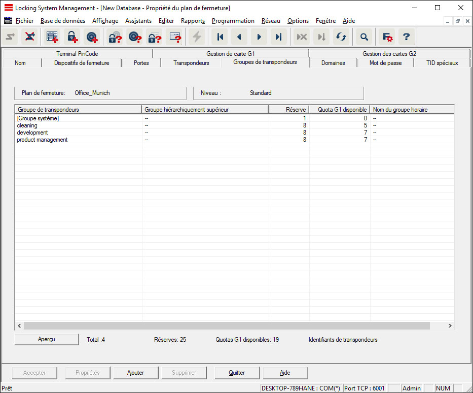 Cet onglet offre un aperçu de tous les groupes de transpondeurs associés à l’installation de fermeture. L'affichage se présente sous la forme d'un tableau détaillé.