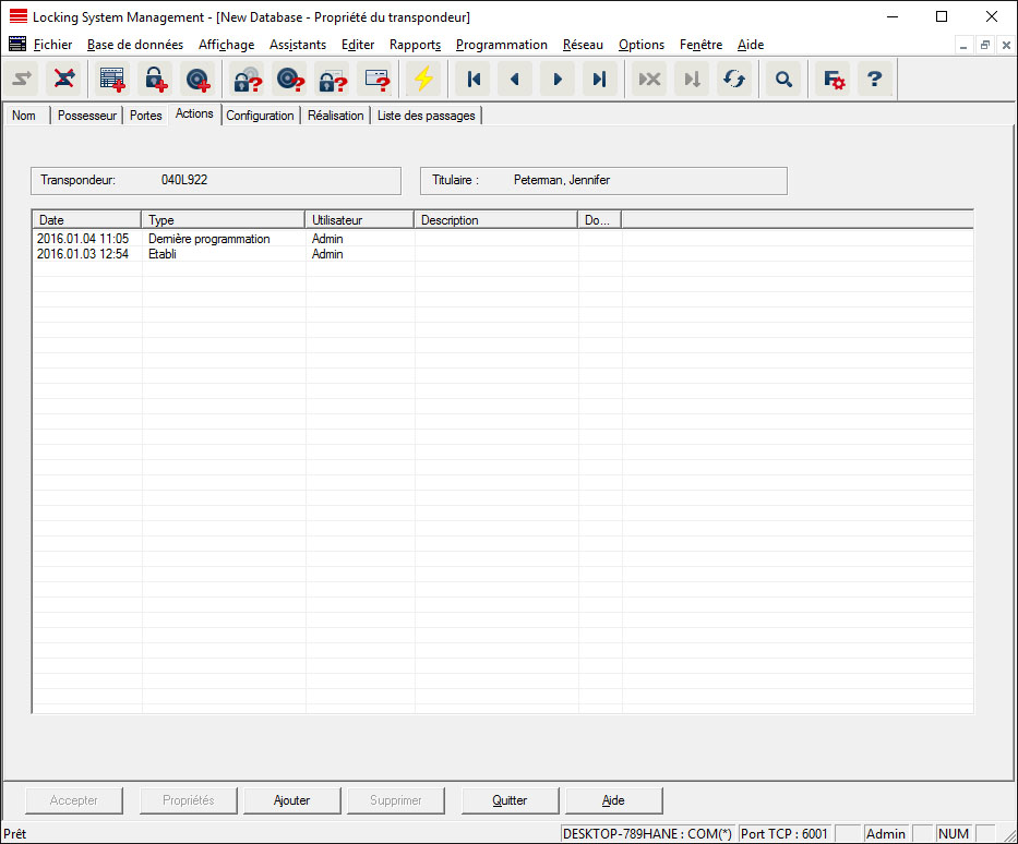 Ce tableau montre les actions (par ex. programmation, modification d’autorisation, etc.) qui ont été effectuées sur le transpondeur sélectionné. Certaines actions comme par ex. « restitution prévue » peuvent être simplement ajoutées à l’aide du bouton « Ajouter ».