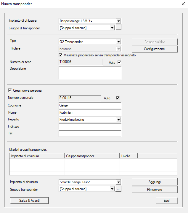 - Con il pulsante "Salva & Avanti" il transponder viene creato nel piano di chiusura. Scegliere "Termina" per ritornare alla matrice o creare subito un altro transponder.