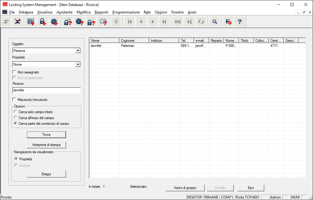 La ricerca consente di cercare diversi oggetti, quali ad es. una determinata porta o transponder, comodamente all'interno del database.