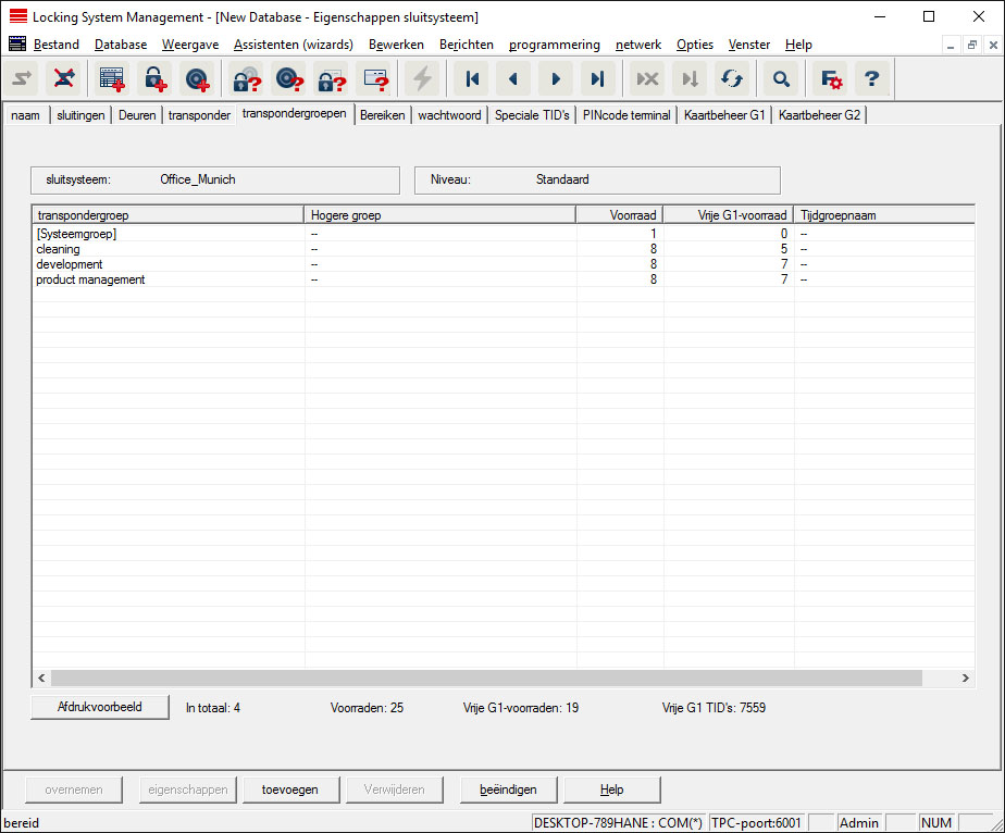 Deze registerkaart geeft een overzicht van de transpondergroepen die in het sluitsysteem worden gebruikt. Ze worden allemaal gedetailleerd weergegeven in een tabel.