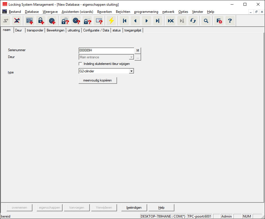 - Geeft het serienummer van het sluitelement aan. De button "..." geeft de eigenschappen van de deur aan.