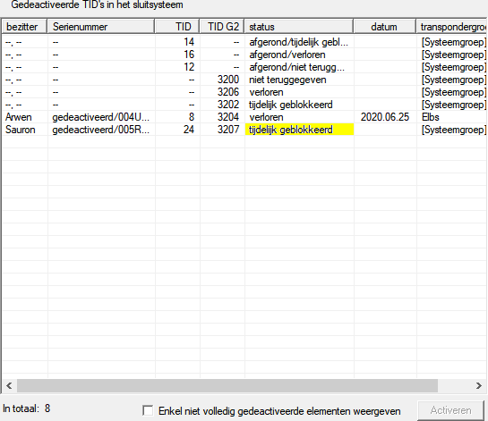U ziet de tijdelijk geblokkeerde transponders in de eigenschappen van het sluitsysteem onder de registerkaart Speciale TID's.