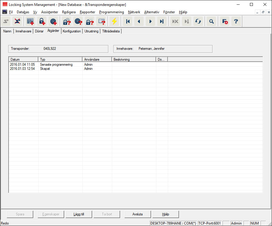 I denna tabell visas vilka åtgärder (t.ex. programmering, behörighetsändring, etc.) som har genomförts på vald transponder. Vissa åtgärder, t.ex. planerad återlämning, kan även läggas till manuellt med knappen ”Lägg till”.